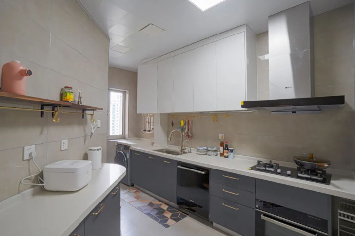 大多数家庭会装上下两排橱柜,最大化利用垂直空间,把锅具、餐具、不常用的食材收在柜内;墙面也别浪费:贴几个挂钩挂常用厨具(如锅铲、汤勺),或装置物架放调料瓶,让操作台保持简洁干净,不用每次做饭都在杂物堆里找东西。