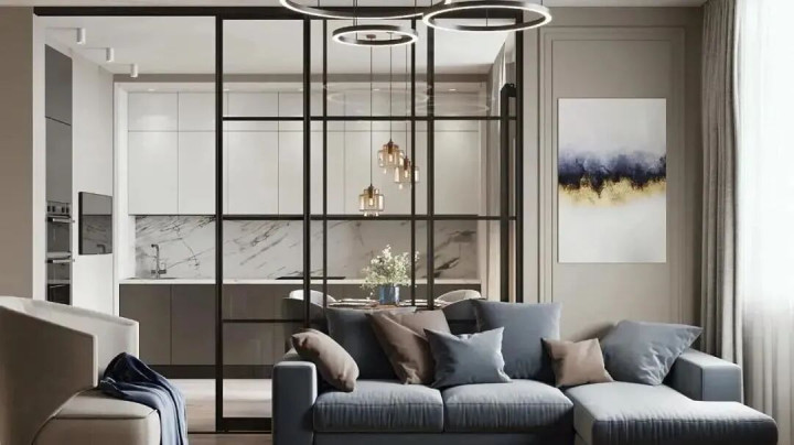 若担心开放式厨房油烟大,不想完全打通,可用玻璃推拉门做隔断 —— 通透不遮挡光线,能起到视觉扩宽空间的作用,做饭时关上门挡油烟,平时打开门又能保持空间连贯,兼顾实用与美观。